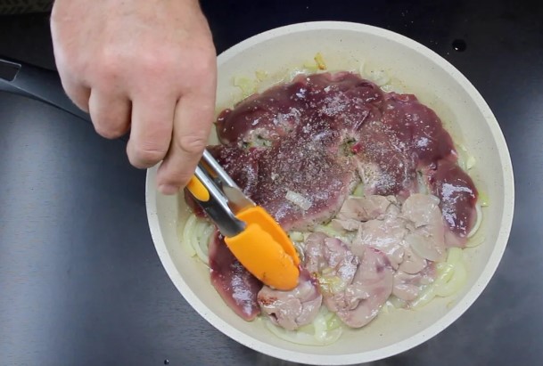 Posolić i popieprzyć do smaku. Sól należy dodać pod koniec, aby wątróbka nie stwardniała. Piec przez ok. 2 minuty. Odwrócić wątróbkę na drugą stronę i piec.