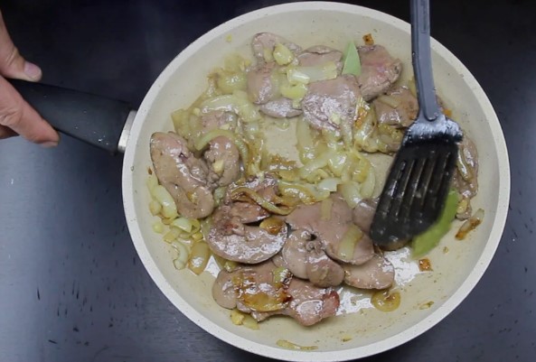 Dodać liście laurowe do wątróbki, gdy nabierze białego koloru. Poczekać jeszcze kilka minut, a następnie wstawić patelnię do piekarnika. Dzięki tej metodzie wątróbka będzie delikatna i soczysta.