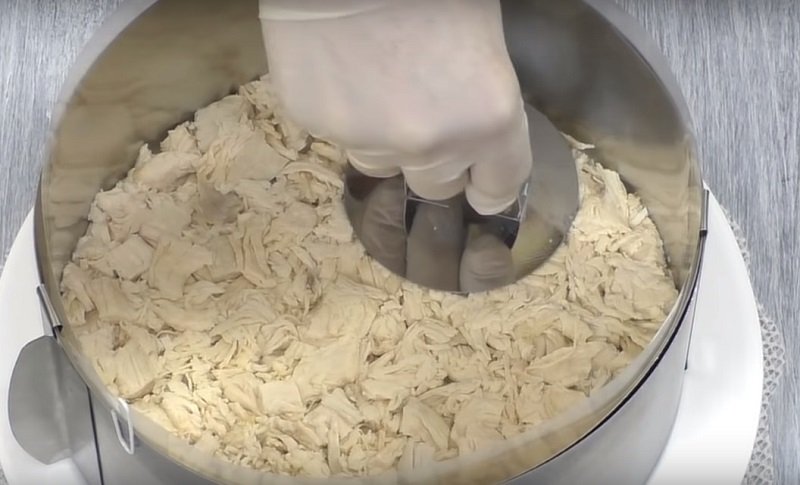 Ser zetrzeć na drobno używając do tego również tarki. Z przygotowanych składników układać kolejno warstwy. Pierwsza warstwa to kurczak i wyłożony na niego majonez, a na nim rozsypana część ziół.