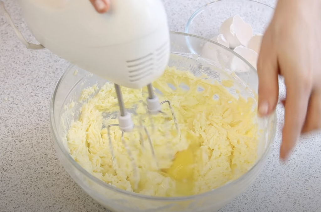 Do miski przekładamy miękkie masło (lub margarynę), wbijamy jajka i dodajemy cukier puder. Wszystko dokładnie miksujemy. Kolejno dodajemy sól, proszek do pieczenia i stopniowo dosypujemy mąkę pszenną. Wszystko miksujemy do powstania gładkiej masy.