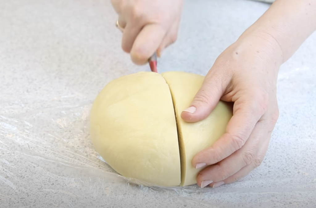 Z ciasta formujemy kulę, zawijamy ją w folię spożywczą i wkładamy do dobrego schłodzenia (około 40 minut). Po tym czasie wyjmujemy ciasto z lodówki, odwijamy z folii i kroimy na dwie równe części.