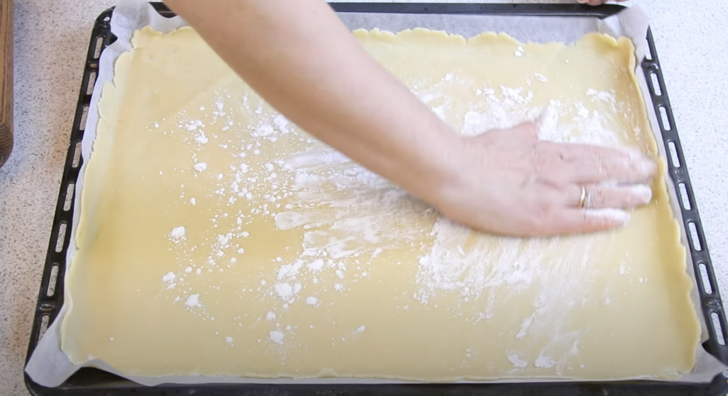 Jedną część rozwałkowujemy na podsypanej mąką stolnicy. I przekładamy na dużą blachę wyłożoną papierem do pieczenia. Drugą część ciasta odkładamy do lodówki.