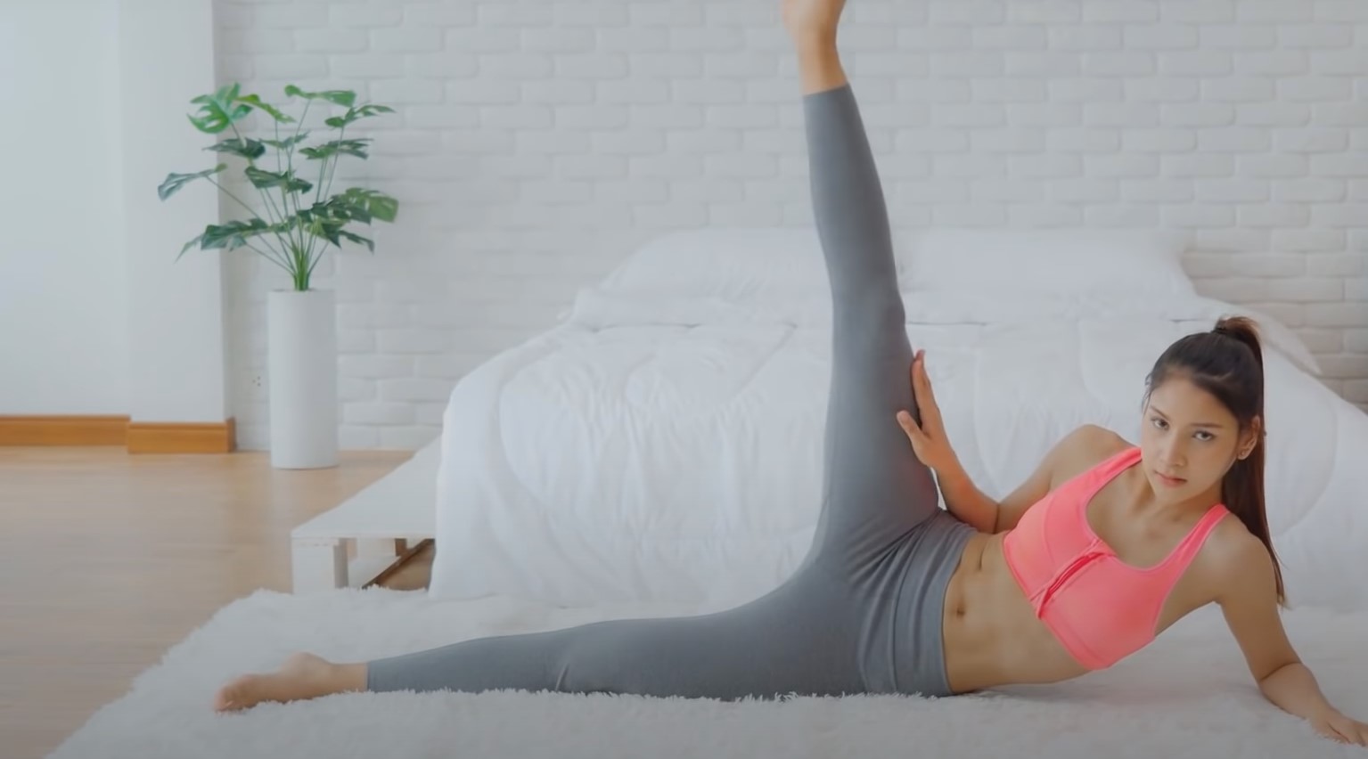 Oprzyj łokieć na łokciu i połóż się bokiem na macie. Wyprostowaną nogę należy podciągnąć do góry, aby utworzyć kąt prosty z drugą nogą. Ćwiczenie to należy wykonywać przez 30 sekund na każdą stronę i 30 sekund na każdą stronę.