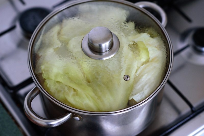 W dużym garnku (takim, który pomieści całą kapustę) zagotuj wodę. Z kapusty zdejmij górne liście, warzywo włóż do gotującej się wody. Poczekaj, aż liście zaczną same odchodzić.