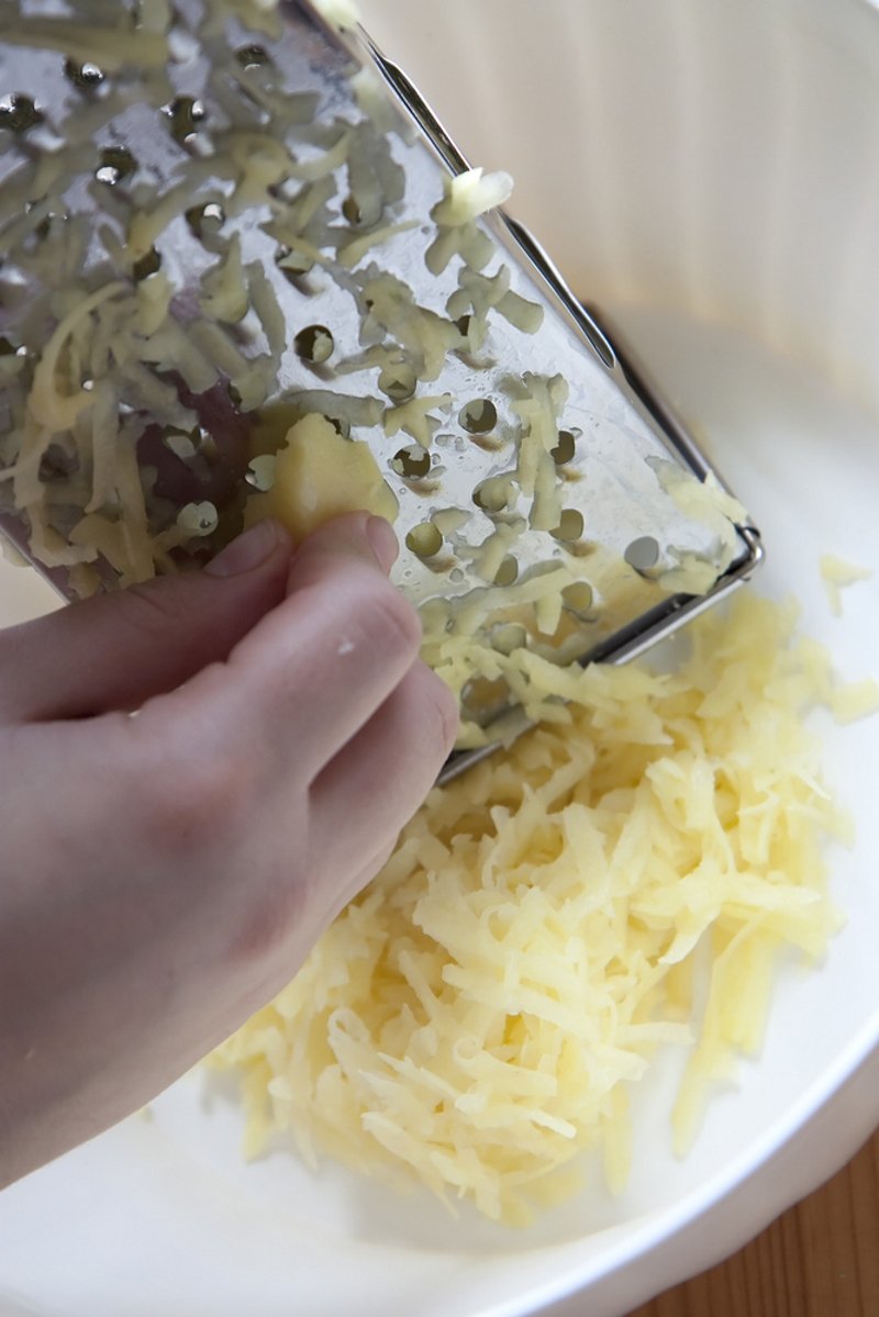 Obierz ziemniaki i zetrzyj na tarce z grubymi oczkami, dodaj do mielonego mięsa i lekko podsmaż. Gdy ziemniaki są jeszcze na w pół surowe – dopraw farsz solą i pieprzem, patelnię zdejmij z ognia (alternatywą dla ziemniaków jest gotowany ryż).