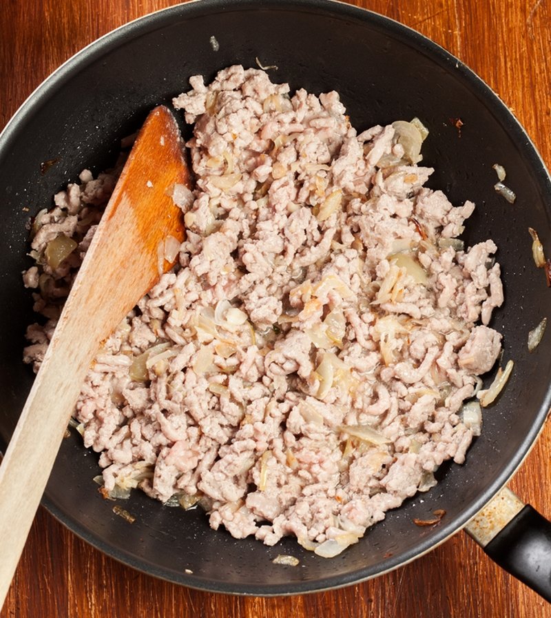 Do cebuli dodaj mięso mielone i smaż je na małym ogniu. Następnie przygotuj ziemniaki. Obierz je i zetrzyj, Użyj do tego tarki o dużych oczkach.